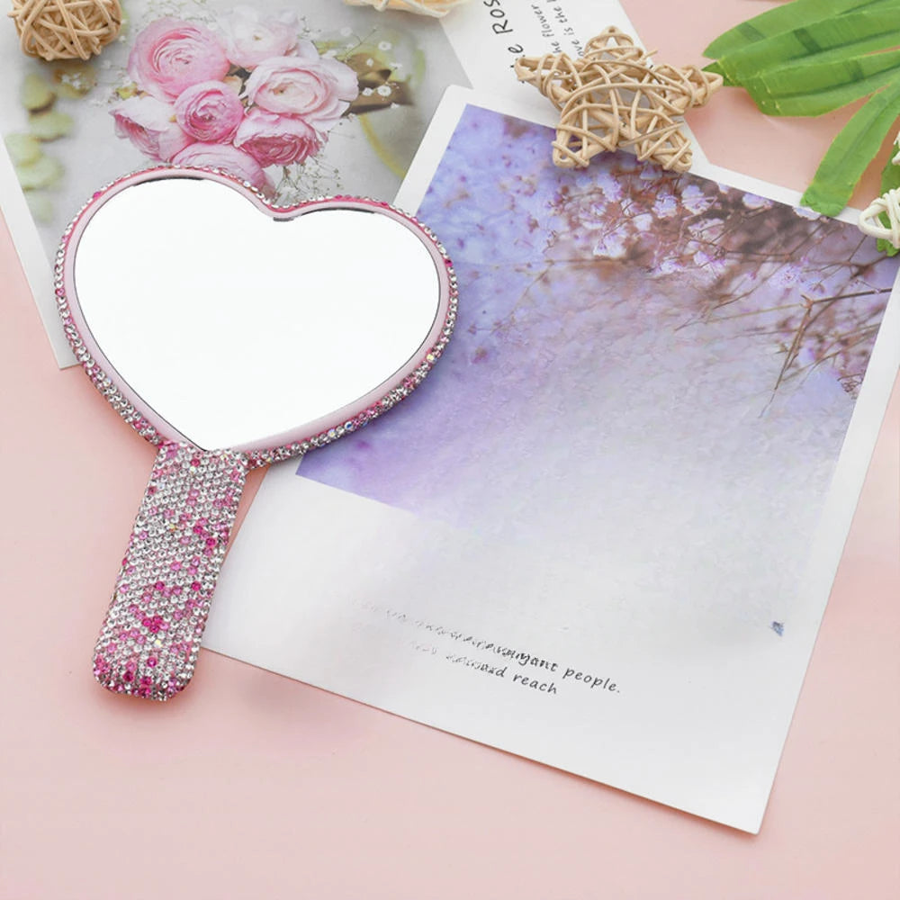 Diamond Handheld Makeup Mirror Love Heart Mirror Female Handle Makeup Cosmetic Beauty Tools Handheld Vanity Girls Make Up Mirror