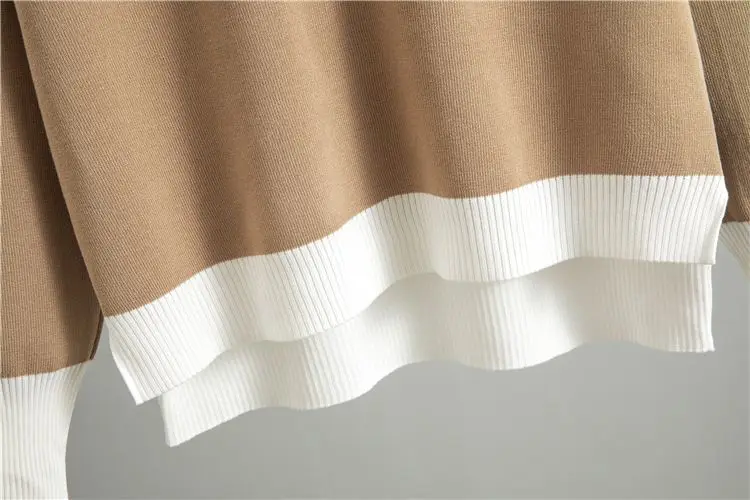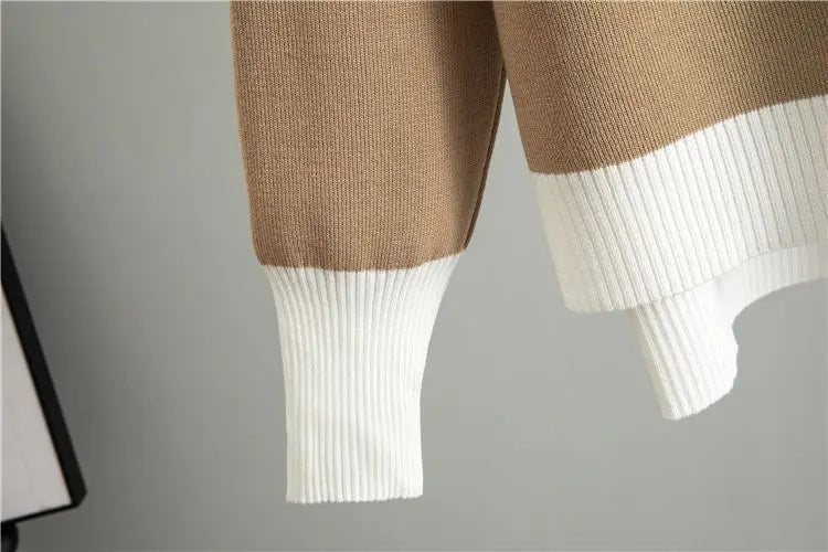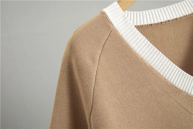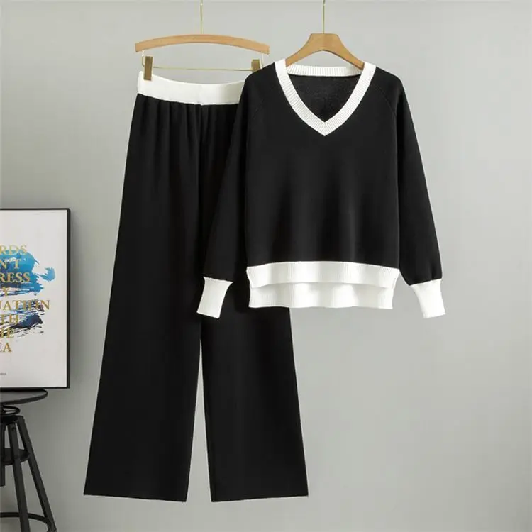 Fashionable Casual Suit for Women 2025 Spring and Autumn V-neck Contrasting Sweater Loose Wide-leg Pants Two-piece Set