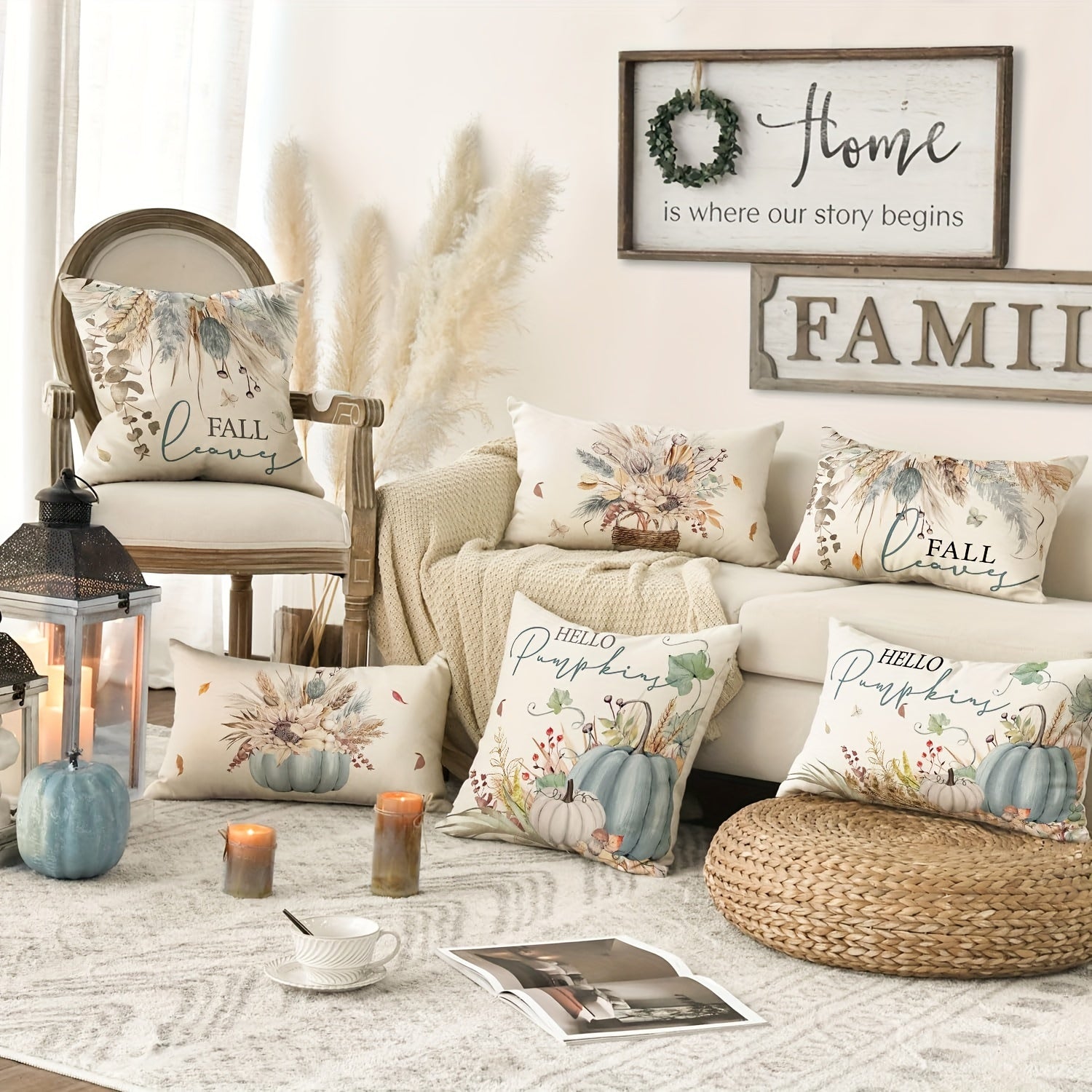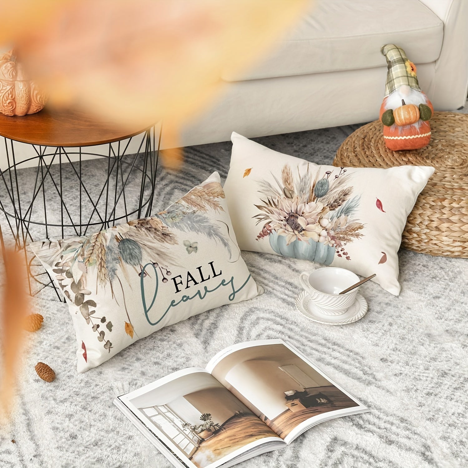 Set of 4 Autumn Seasonal Throw Pillow Covers - Vibrant Fall Pumpkin Wheat Cotton Sunflower Design, 12 x 20 Inch Blue Cushion Case for Sofa Couch - Soft, Durable, and Reversible with Zipper Closure for Easy Insertion and Remov