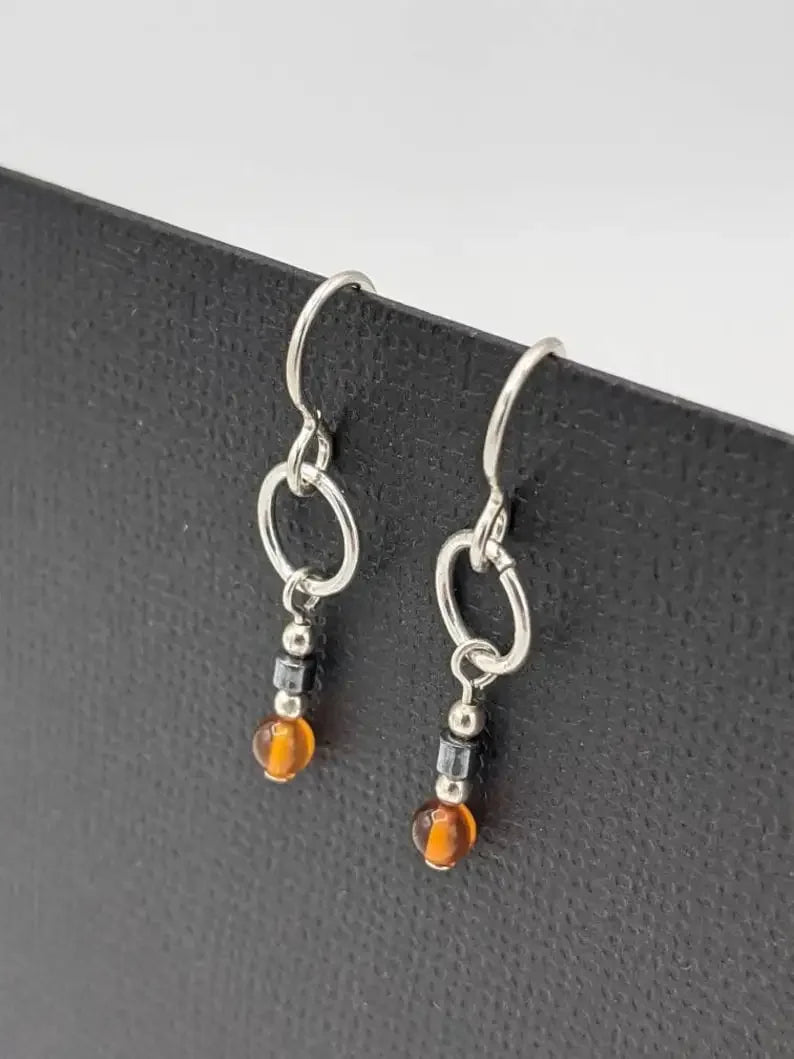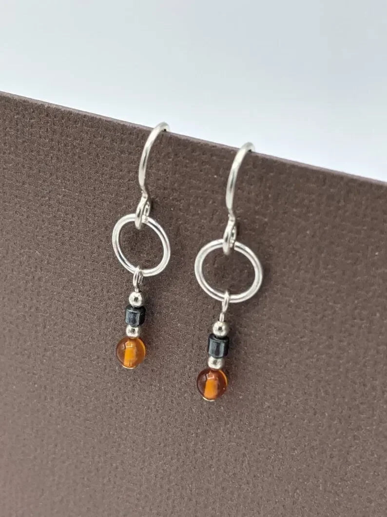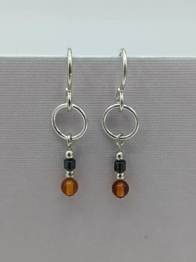 Amber earrings, small ring pendant earrings, real amber and hematite earrings