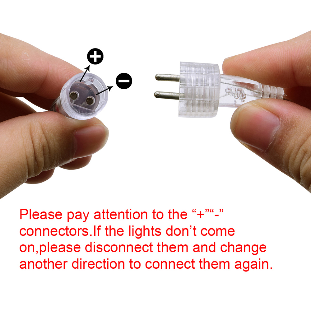 * Note: The tail plug must be connect "+" to "+" and "-" to "-", if you connect two strings together, but it can not work, please change the plug direction, and connect them again.