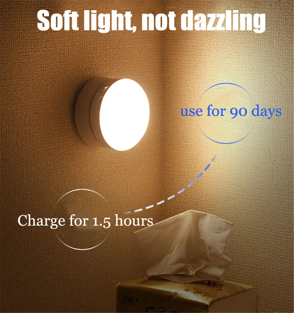 The motion sensor night light is powered by built-in rechargeable battery, you can charge it via a USB cable, or USB port. You don't need to keep changing batteries constantly, which is annoying & not eco-friendly. This motion sensor light is 360° rotatable, place the light inside the base and rotate the motion sensor light any direction that you need. It can meet various usage requirements indoors.