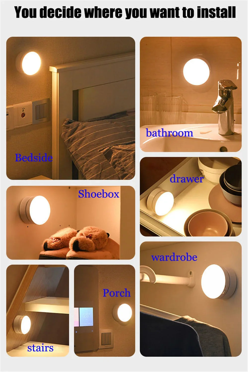 The magnetic wall light is magnetically connected to the base, The cabinet light can be rotated at any 360°. You can stick the motion sensor light to everywhere such as bathroom ceiling, kitchen cupboard, hallways, stairs,wardrobe, cabinet, closet, garage and so on. and can also be disassembled as a flashlight and emergency light.