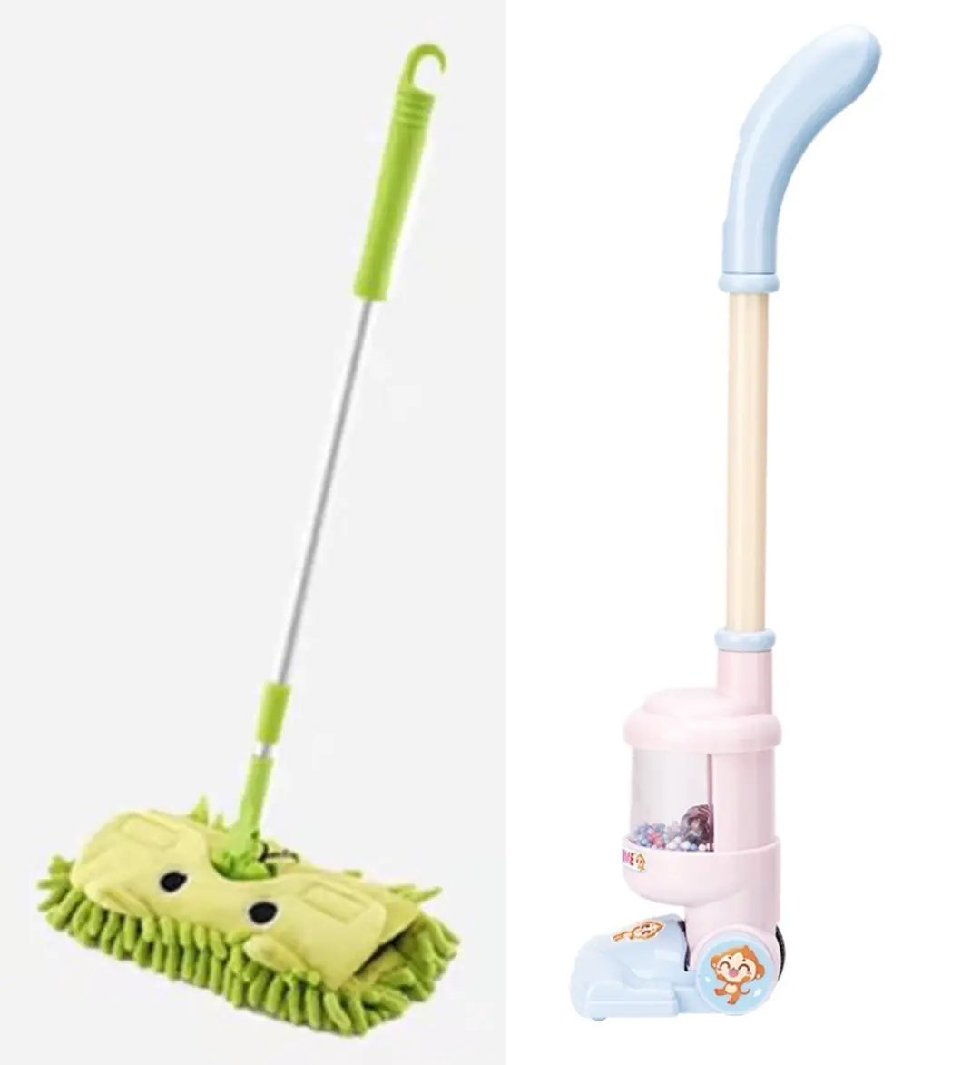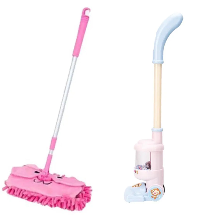 Choose from options like the single broom, broom + dustpan, or the complete three-piece set that includes a mop and a vacuum cleaner in delightful colors such as blue, pink, and green.