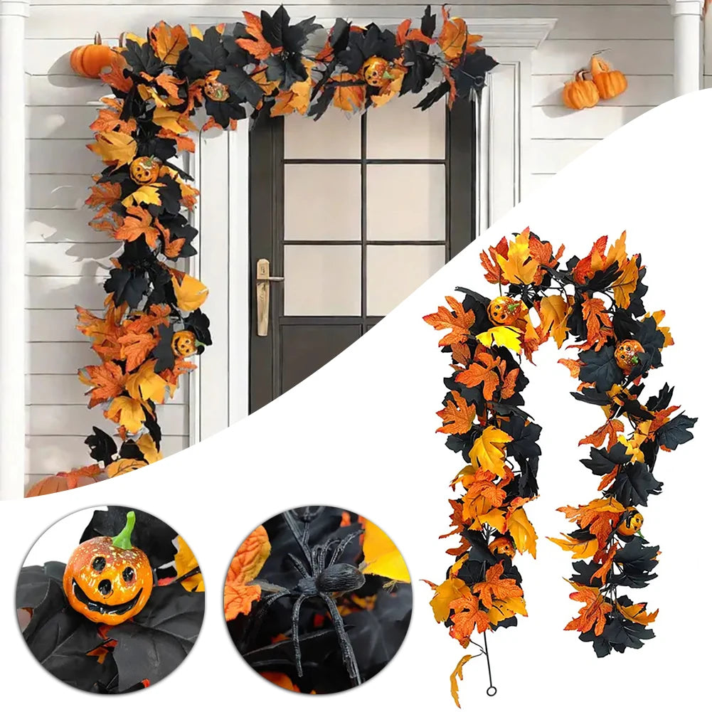 For Halloween Garland for Spookys Fall Decor 5.74ft Gothic Maple Leaf Pumpkin-Vine with Spiders Accents for Fireplace Decoration